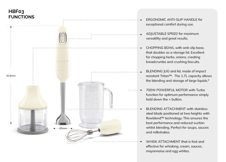 The Smeg hand blender comes complete with the following accessories: a beaker, a chopper with stainless steel blades, and lastly, a stainless steel whisk