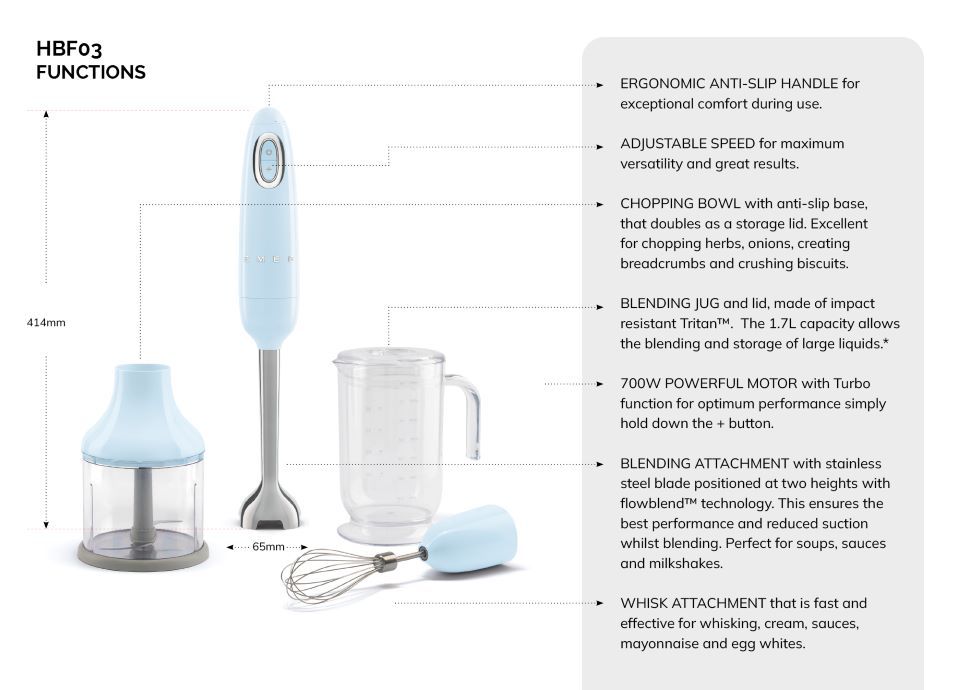 The Smeg hand blender comes complete with the following accessories: a beaker, a chopper with stainless steel blades, and lastly, a stainless steel whisk
