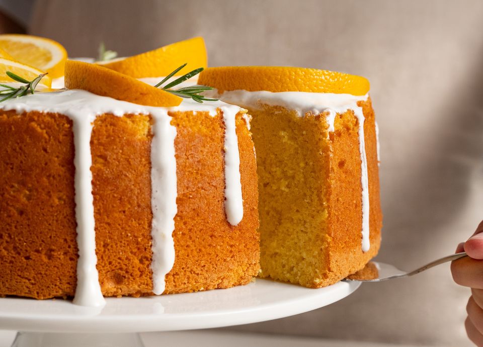 Divide egg whites from the yolks. In a bowl mix the oil, the water, the yolks, the grated orange peel, and the juice. Start whipping the egg whites with a pinch of salt and halfway, add some cream of tartar (it will help to keep the result firmer). Preheat the oven to 160°. Put all the powdered ingredients (flour, baking powder, and sugar) in a different bowl and mix them.